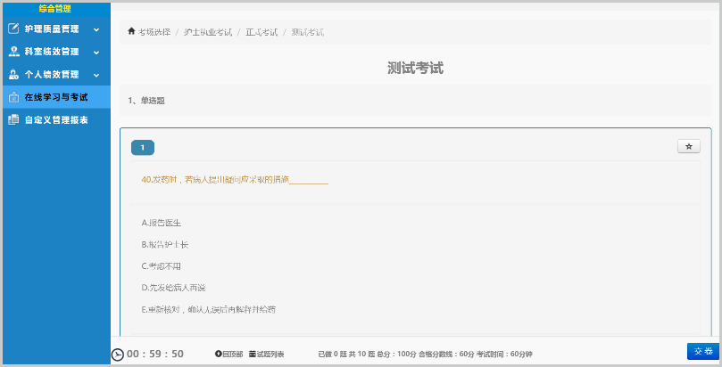 針對(duì)醫(yī)院等級(jí)評(píng)審和日常護(hù)理管理需要,護(hù)理在線學(xué)習(xí)與考試系統(tǒng),可以方便地完成全程在線學(xué)習(xí)、考試、統(tǒng)計(jì)以及持續(xù)跟蹤,試題設(shè)置、一鍵下發(fā),在線學(xué)習(xí)、省心省力。